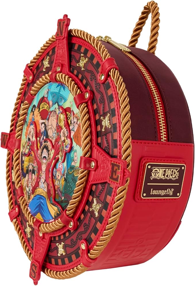 Esta mini mochila tiene forma de brújula. Encontrarás letras doradas que marcan el norte, sur, este y oeste. En el centro, en un marco circular de cuerda auténtica, encontrarás una imagen de todos tus personajes favoritos de One Piece .
